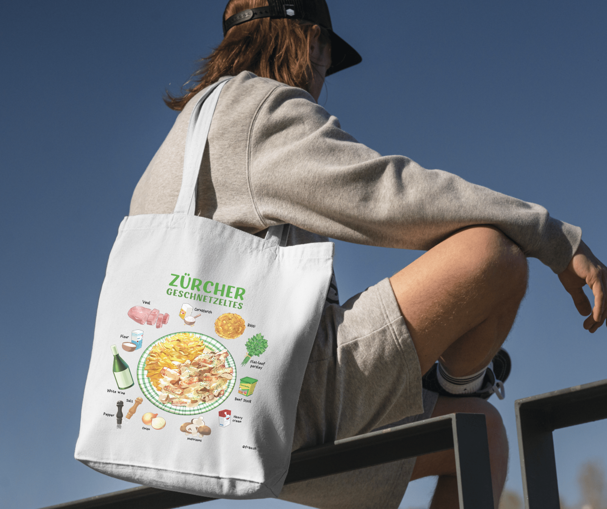 Discover our tote bags with lovingly illustrated recipes – sturdy, sustainable, and a real eye-catcher for the city, the market, and everyday life. Designed and produced in Zurich with a wink.