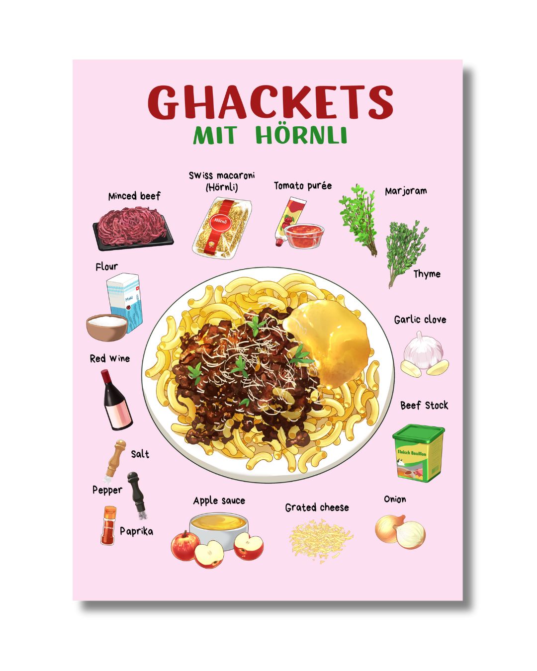 Liebevoll illustrierte Rezeptkarte für deinen Schweizer Küchenklassiker – perfekt zum Verschenken, Sammeln oder Aufhängen.
